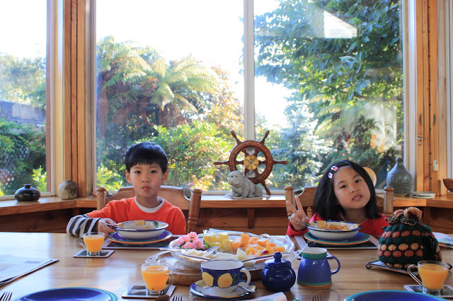 一早迎接我們的還是豐盛的早餐,除了一大盤水果以外,跟昨天不同的是還多了一杯現柞的橘子汁,Leonie說這是自己院子種的橘子,可能會有點酸,果然小孩嫌不好喝,我倒覺得剛剛好,所以連小孩的份一起喝了。