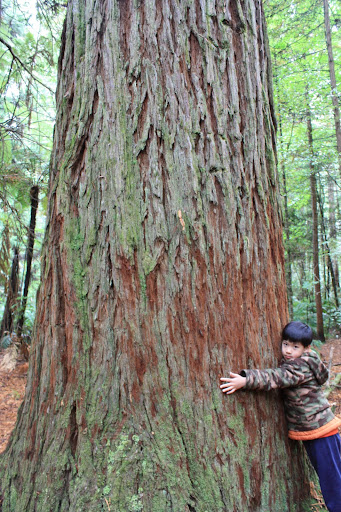 我們決定從距離最近的景點開始,開車不到五分鐘就來到The Redwood,可能是因為今天沒出太陽,加上森林裡的溫度本來就比較低,所以我們走在Redwood的步道覺得稍有寒意。Redwood名稱的由來我想是因為這座森林裡,有一種紅色樹幹的樹佔了大多數,根據資料上寫,這些樹是在1901年栽種的,時至今日,這些樹已經有神木的架勢了,真的很壯觀呢。